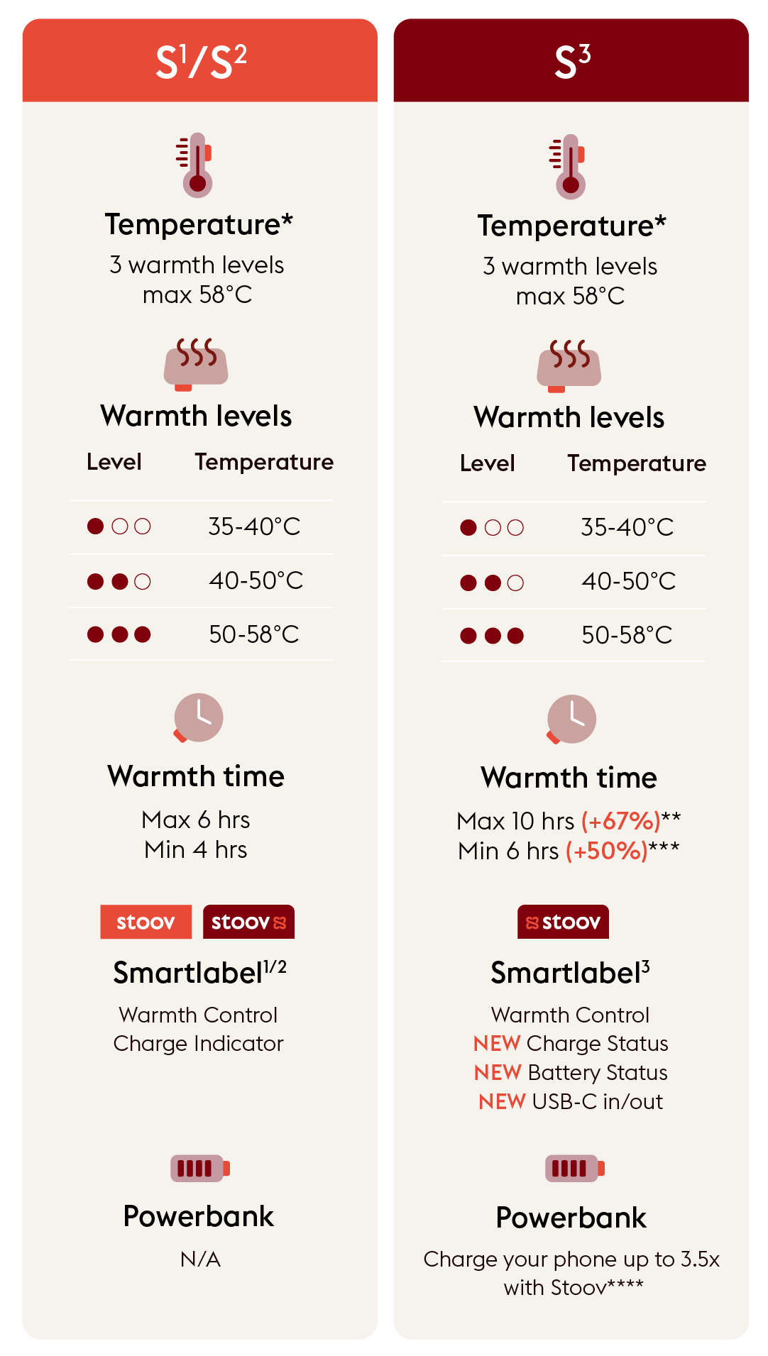Depending on the product, the battery type and heat setting, a Stoov keeps you warm for up to 14 hours on a single charge. Perfect for a full workday, a long evening on the couch or a night of camping.